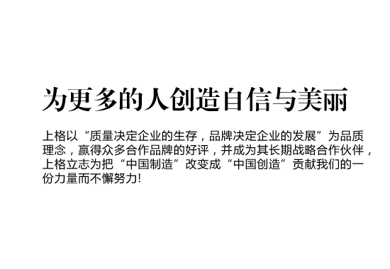 上格一路走來,以“締造時尚集團(tuán),使公司受人尊敬,令人向往;為客戶提升價值,創(chuàng)造成功;讓員工提高生活品質(zhì),實(shí)現(xiàn)自我價值”作為我們的目標(biāo),“為更多的創(chuàng)造自信與美麗” 作為我們的使命,立志為把“中國制造” 改變成“中國創(chuàng)造”貢獻(xiàn)我們的一份力量而不懈努力!